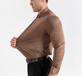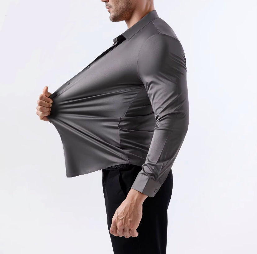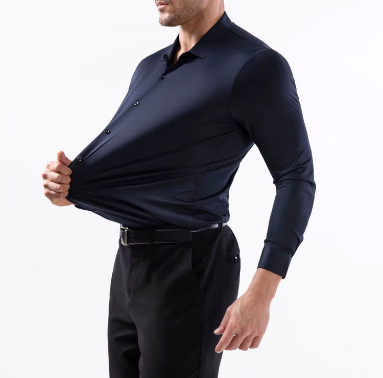 A modern essential redefined. Our Men’s Stretch Dress Shirt in crisp white delivers the perfect balance of sharp style and all-day comfort. Made from a premium stretch fabric, it moves with you while maintaining a clean, tailored silhouette. Designed with a classic collar, sleek button placket, and a smooth finish, this shirt transitions effortlessly from formal meetings to evening outings. Dress it up with a blazer or keep it polished with tailored trousers — a true wardrobe staple.